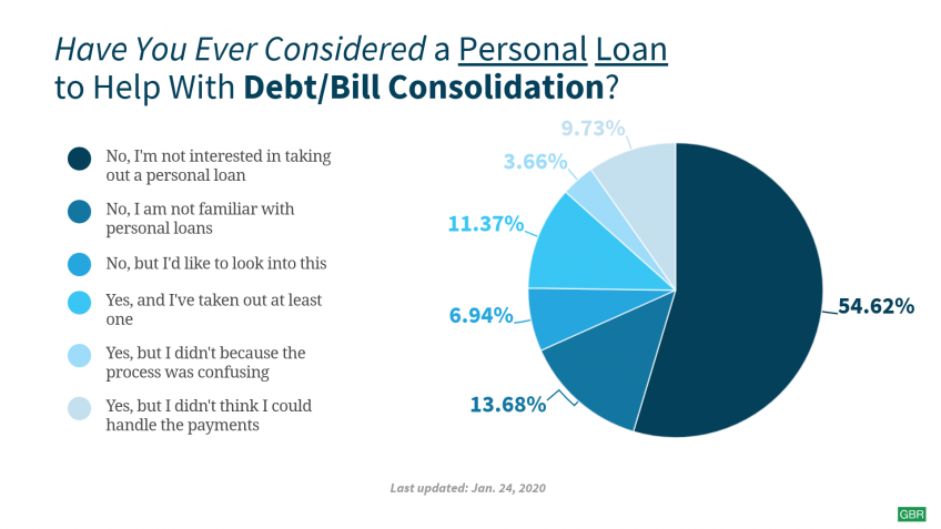 Despite being a major source of stress, many survey respondents were still unwilling to turn to some basic tools for fighting off debt. And considering most survey respondents aren’t dealing with a massive amount of consumer debt, they could be missing out on potentially reaching their debt-free goals sooner. When asked about considering a personal loan to consolidate their debt, 3 out of 4 people (75.24%) said that they had not considered the option. And from all respondents, about 54.62% said they weren’t interested in taking out a personal loan.