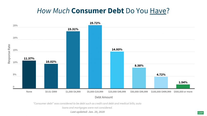 GOBankingRates, in partnership with Discover, surveyed 1,038 Americans ages 18 and older between Dec. 23, 2019, and Jan. 6, 2020, asking six different questions: (1) How often do your bills and/or debt cause you to feel stressed?; (2) Which of the following would you do if you were debt-free?; (3) How long do you believe it will take you to get out of debt?; (4) What is the No. 1 reason that caused you to go into debt? (single select); (5) How much consumer debt* do you have? (*i.e., credit card debt, medical bills; not auto loans or mortgages); and (6) Have you ever considered a personal loan to help with debt/bill consolidation? All respondents had to answer “Yes” to the following screen question to participate in the survey: Do you have any debt? (i.e., loans, medical bills, credit card debt, etc.). GOBankingRates and Discover used Survata’s survey platform to conduct the poll.