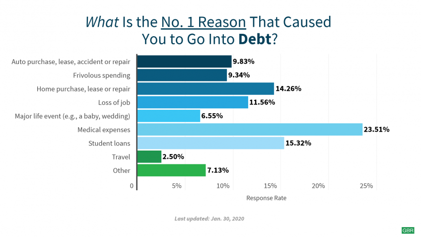With rising healthcare costs, it’s no wonder many people are going into debt from medical expenses. The survey revealed that medical expenses are in fact the top reason respondents went into debt at 23.51%.
